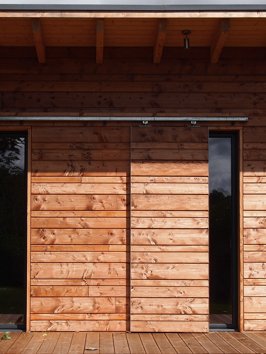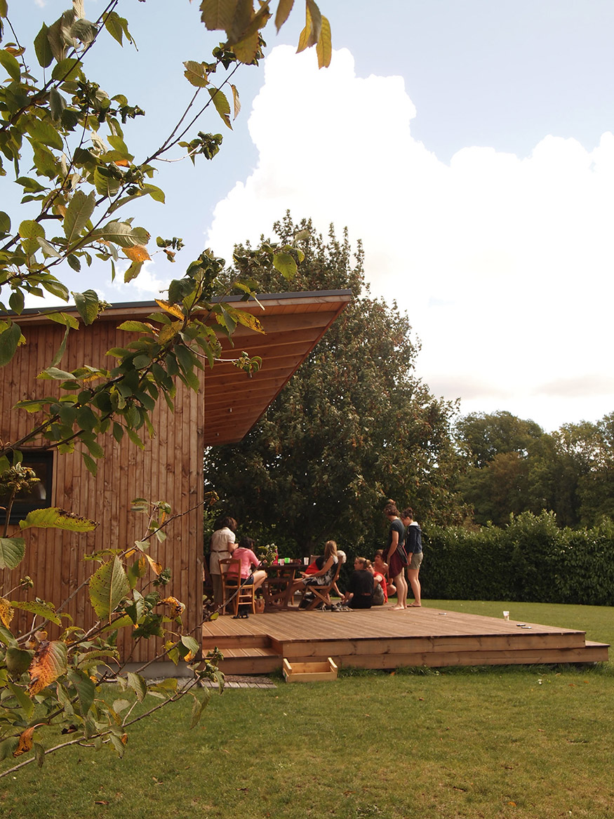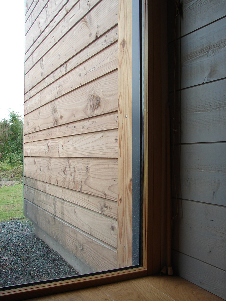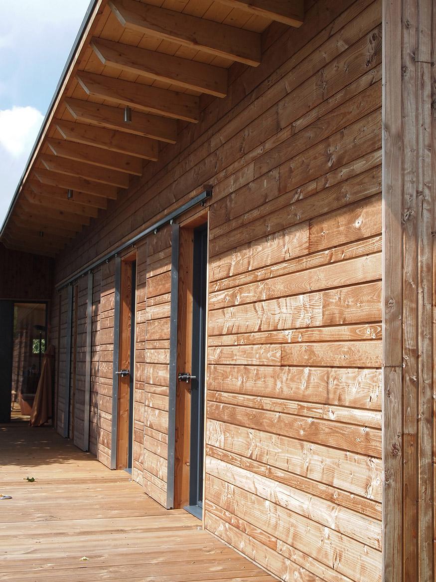 The house has a surface area of 190 m2 and is constructed from prefabricated timber panels, clad with douglas wood. The shape is compact to keep the surface area of the facade as small as possible. It consists of two volumes separated by a corridor. On the south side are the bedrooms and the kitchen. On the north side the entrance, bathroom, storage and garage. Large windows facing south provide free heating in winter. In summer, the overhang of the roof keeps the heat out.