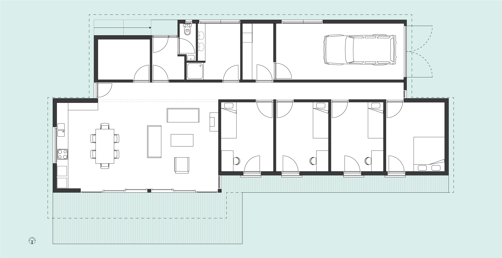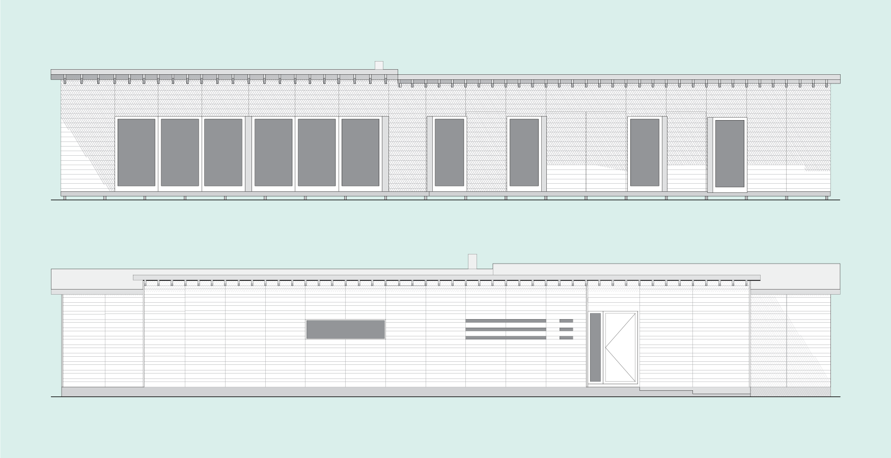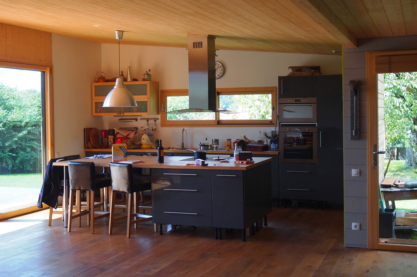 The house has a surface area of 190 m2 and is constructed from prefabricated timber panels, clad with douglas wood. The shape is compact to keep the surface area of the facade as small as possible. It consists of two volumes separated by a corridor. On the south side are the bedrooms and the kitchen. On the north side the entrance, bathroom, storage and garage. Large windows facing south provide free heating in winter. In summer, the overhang of the roof keeps the heat out.